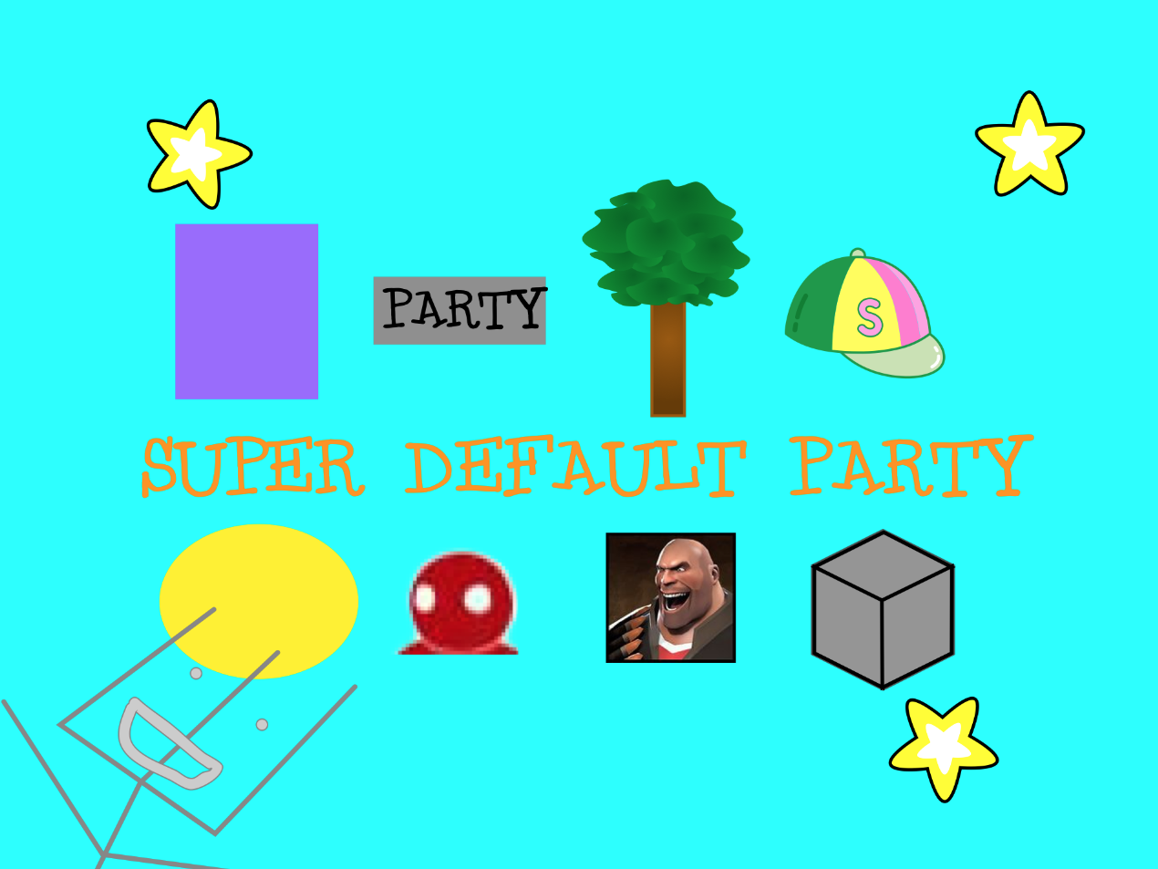 Protagonist(s): Purple Square, Party Button, Tree, Hat, Yellow Circle, Gang Beasts Guy, Heavy, Fork (Image), Cube